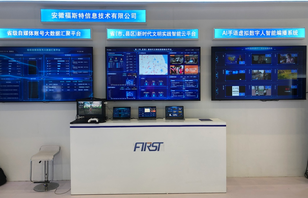 安徽福斯特信息技術(shù)有限公司此次應(yīng)邀參展,以廣電媒體發(fā)展為亮點,集中展示大數(shù)據(jù)、人工智能,呈現(xiàn)了AI-VLOG視頻智能合成系統(tǒng)+AI手語虛擬數(shù)字人智能編播系統(tǒng)+省級自媒體賬號大數(shù)據(jù)匯聚平臺+?。ㄊ?、縣區(qū))新時代文明實踐智能云平臺技術(shù)。